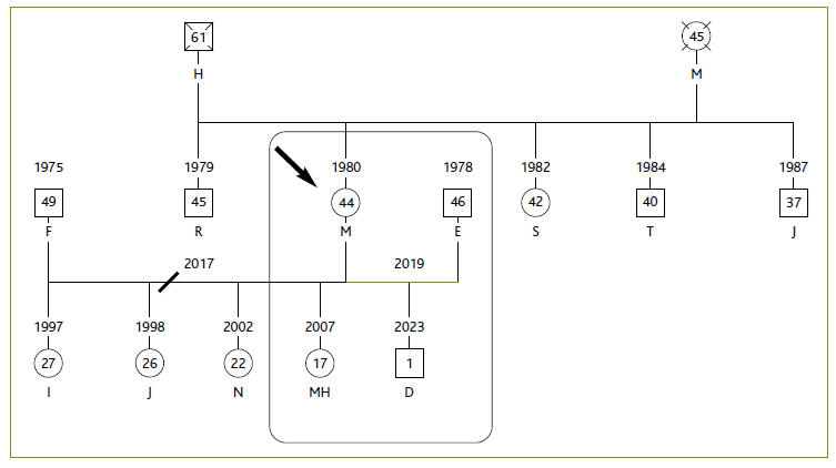 Encontra-se seguidamente ilustrado o genograma familiar de M. (Figura 1), sendo que se apresentam três gerações. Não se verifica história de consanguinidade.