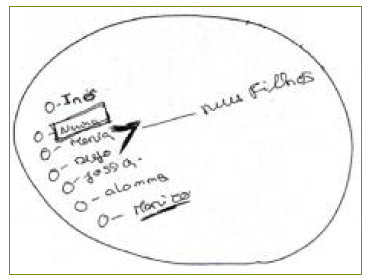 A utente foi convidada a desenhar o círculo familiar de Thrower (Figura 2). Quando interrogada se estava satisfeita com a ilustração respondeu que: “Sim, porque os meus filhos, a minha neta e o meu marido são as pessoas da minha vida” (sic). Quando questionada se mudava alguma coisa respondeu: “Não. Estou contente com as pessoas que tenho à minha volta” (sic). E, por fim, quando inquirida sobre a quem recorreria num momento de maior aflição ou na resolução de um problema respondeu: “Ao meu marido ou à minha filha N., embora não goste muito de a chatear, pois ela tem a sua vida” (sic).