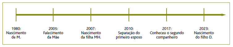 Ainda se elaborou a linha de vida de Medalie da utente (Figura 3). Neste sentido questionou-se M. acerca das datas mais marcantes na sua vida, tendo M. referido seis datas: 1980 (o seu nascimento), 2005 (o falecimento da sua mãe), 2007 (nascimento da filha MH, trigger para que se separasse do seu primeiro esposo), 2010 (a consumação da separação com o primeiro companheiro), 2017 (ano em que conheceu o seu segundo companheiro) e 2023 (ano do nascimento do seu filho D.).