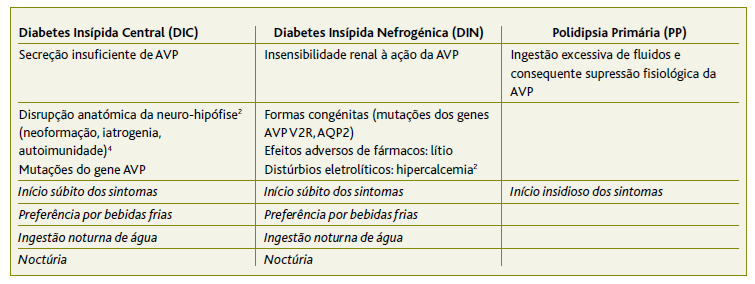 A homeostasia da água é essencial para o bom funcionamento do organismo, sendo regulada principalmente pela hormona vasopressina e pelo mecanismo da sede.1 Distúrbios neste equilíbrio podem levar ao desenvolvimento do síndroma polidipsia-poliúria - condição caracterizada pela ingestão excessiva de água (mais de três litros/dia) e eliminação aumentada de urina (mais de 50ml/kg/24h). 2 O diagnóstico diferencial deste síndroma é crucial para determinar o tratamento adequado, 2 de forma a evitar complicações como a hiponatremia grave. 3 Existem diferentes etiologias, nomeadamente diabetes insípida central, diabetes insípida nefrogénica e polidipsia primária, 4 sumariamente descritos na Tabela 1.