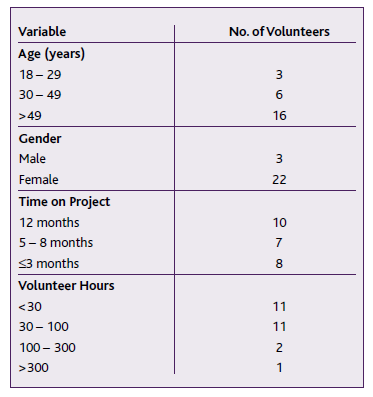 Among the 25 participants, 11 completed less than 30 hours of volunteering; 11 completed 30 to 100 hours; two performed 100 to 300 hours, and one performed more than 300 hours - Table I. On average, participants completed approximately 48 hours of volunteering.