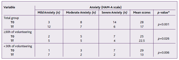 At the beginning of the study (T0), according to the scale HAM-A, three participants presented mild anxiety levels, eight moderate anxiety, and 14 severe anxiety. After intervention (Tf), only six of them remained with severe anxiety.