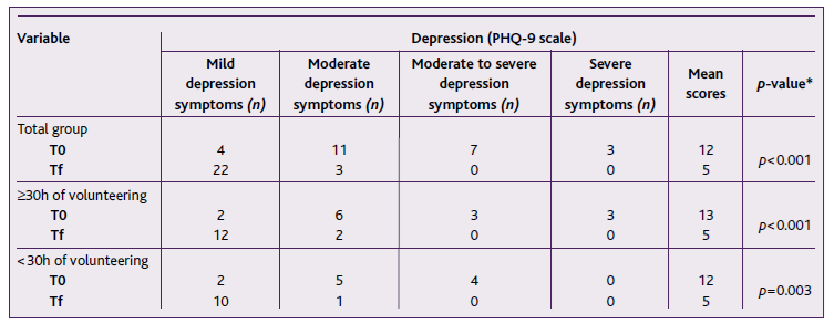 Highlighting the group of volunteers who volunteered ≥30 hours (n=14), 12 participants had mild depressive symptoms at the end of the study, and two presented moderate symptoms; no one presented severe depressive symptoms.
