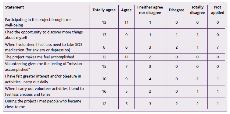 Furthermore, 85% of participants agreed that they felt less tense and anxious when volunteering and more than 75% of participants increased their interest and pleasure in day-to-day activities. For 68% of participants, the project increased the network of people close to them.