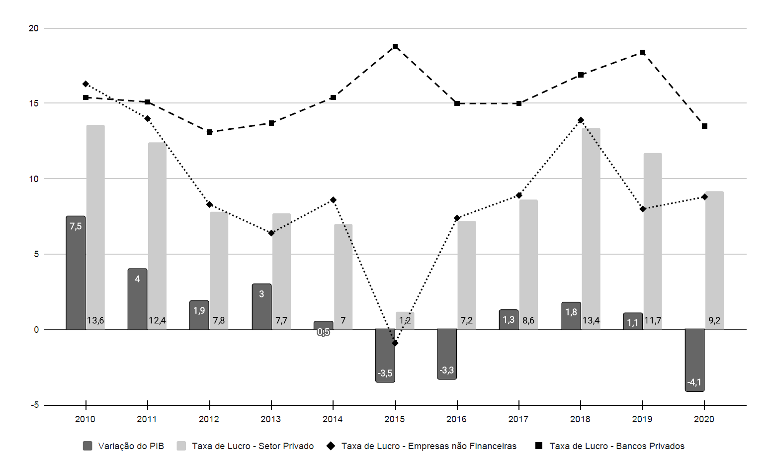 Diante dos dados, podemos perceber uma queda no crescimento do PIB, especialmente em 2014, que marcou um crescimento de apenas 0,5%. A crise se agravou em 2015 e 2016 com valores negativos de 3,5% e 3,3% respectivamente. Além disso, chama atenção a expressiva queda da taxa de lucro a partir de 2012 e até 2015, particularmente das empresas não financeiras. Merece destaque a discrepância entre o lucro dessas empresas não financeiras em relação às bancárias e financeiras, os dados indicam que em 2015 as empresas não financeiras tiveram uma taxa de lucro negativa de ‑0,9% enquanto os bancos privados atingiram o maior valor dessa série com 18,8%.