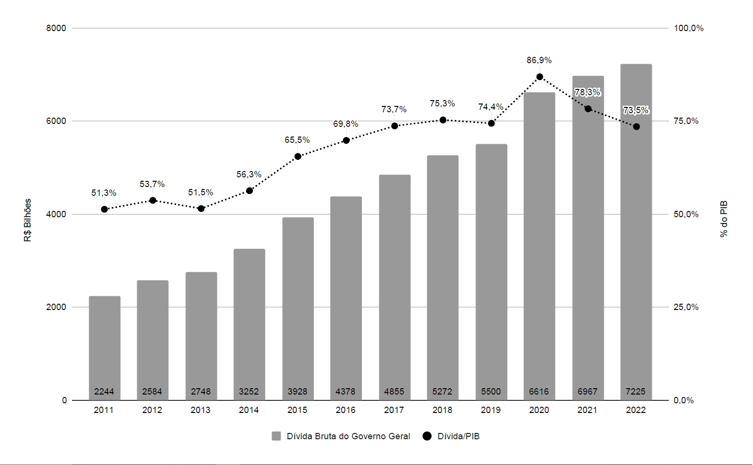 Gráfico 2 Dívida Bruta do Governo Geral e Dívida Bruta do Governo Geral em relação ao PIB. Fonte: Elaboração própria com dados do Tribunal de Contas da União (2023, p. 79).