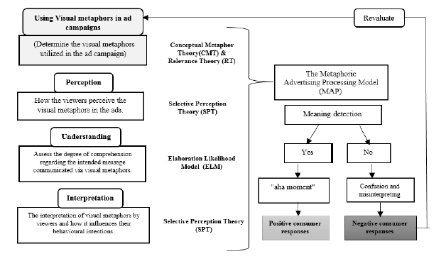 Considering the above, the present research proposes a framework for assessing the efficacy of visual metaphors in advertising campaigns (see Figure 1). This framework accounts for elements such as the audience's ability to perceive, understand, and interpret these metaphors. By drawing on relevant theories, the study aims to enhance marketers' understanding of how visual metaphors influence consumer behaviour, ultimately leading to improved advertising campaigns.