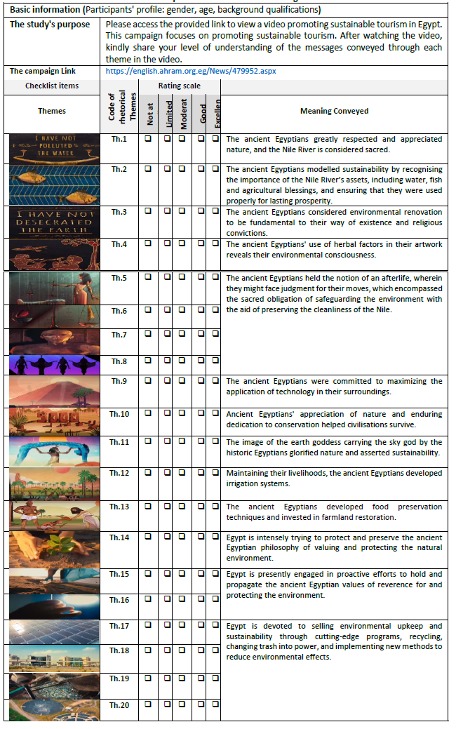 In the second phase, a positivist approach was employed to collect quantitative data by statistically evaluating the responses provided by participants on the checklist. Two distinct groups were purposefully chosen: individuals with diverse knowledge backgrounds and experts in history and heritage. The selection of individuals was based on various criteria, leading the research to utilise a purposive sampling method (Neuman, 2014). Initially, since the interpretation of metaphors often necessitates a higher level of understanding, the audience consisted of those holding a bachelor's degree or higher. Moreover, the campaign included metaphors that symbolised ancient Egyptian civilisation. Thus, the inclusion of individuals with expertise in archaeology and historical research allowed for a comparative evaluation of their comprehension of the video campaign's metaphors and themes related to ancient Egyptians in comparison to individuals with varied educational backgrounds.