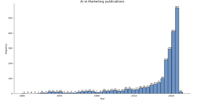 Figure 1 reflects the publication trend under AI and Marketing. Since 1980, 2,255 articles have been published, an average of 51.25 articles per year. However, between 2019 and 2022, 1,493 articles were published, an average of 373.25 articles per year. These results reveal the increasing interest of researchers in this topic.