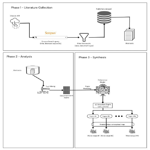Topic modelling was performed for data analysis, particularly LDA. It permits gathering massive amounts of textual information on topics (Ramos et al., 2019). As an input, the text mining structure contains the relevant terms with their frequency in an organised structure where the documents are categorised by topic (Blei, 2012). To conduct the topic modelling analysis, we built a corpus that included the abstract of every article collected. This approach is consistent with other literature analyses using Topic Modeling (Moro et al., 2023). Preprocessing was implemented to reduce subjectivity (Ribeiro et al., 2024). The preprocessing involved eliminating stopwords, articles, and adverbs, transforming all words to lowercase, applying stemming, and lemmatisation to reduce similar words into one.