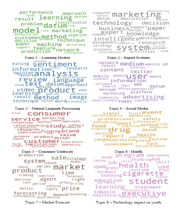 To acknowledge the research topics under the interest of researchers and answer RQ1, topic modelling, notably the LDA algorithm, was performed. We tested the outputs to find optimal topics until a reasonable number of aggregated documents by topic was attained (Ramos et al., 2019). The model was trained by applying several alpha and beta values to get the best coherence score without creating a cognitive load regarding the number of topics. Figure 3 represents a visual representation of the eight topics uncovered by the analysis. The size of each word indicates its relative frequency and importance within a given topic, with larger words appearing more frequently in the analysed abstracts. This allows for a quick interpretation of the central themes and key terms associated with each topic.