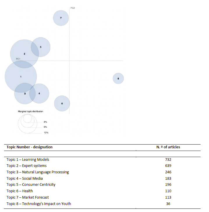 IDM (Figure 4) illustrates the link between marketing and AI and the topic’s similarity. Circles represent the topics, and their proximity reveals their degree of similarity (Shetty & Ramesh, 2021). The size of each circle reflects the predominance and number of articles associated with each topic (Bing-Xin Du, 2021). The IDM divides the topics into Principal Component 1 (PC1) and Principal Component 2 (PC2) to describe the differences and resemblances between topics. Axis X represents PC1, and axis Y represents PC2. Each topic is mapped at a point in the bi-dimensional dispersion graphic, and its position is determined by its PC1 and PC2 score. According to their distribution, the topics can be grouped into clusters. These clusters can help to identify patterns and relationships between the topics under analysis.
