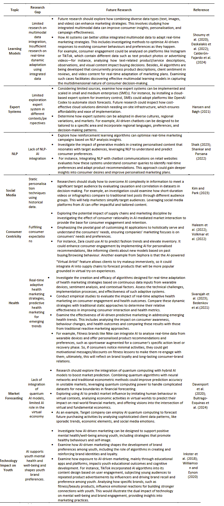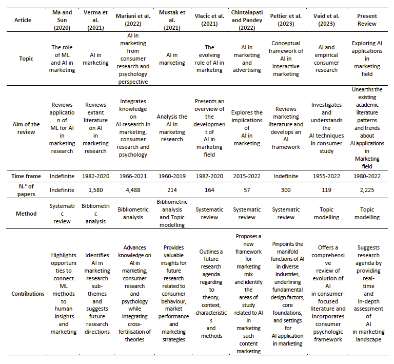 Prior reviews contributed significantly to applying AI in marketing by investigating the effectiveness of Machine Learning (ML) and bringing up issues with model transparency (Ma & Sun, 2020). They also analysed sentiment analysis and advertisement optimisation (Verma et al., 2021). The rapid advances of AI in marketing research revealed ten themes applicable to the current business environment in a multifaceted manner (Mustak et al., 2021). The research only offered insight into the possibilities of using AI and not real-world examples. However, the ability of AI to mimic human actions and mannerisms was investigated to unveil potential uses when conducting intelligent operations (Vlačić et al., 2021). Further, more researchers established the necessity for thorough evaluations of AI solutions while acknowledging limitations in their review (Chintalapati & Pandey, 2022). Others clustered AI facets and connected research across areas, but they needed a thorough, real-time overview (Mariani et al., 2022). Discovery of the different AI tools and techniques that assist consumers to make better decisions without revealing the model that can be implemented to achieve that, limiting their detailed analysis to AI techniques applied to consumer-related issues (Vaid et al., 2023). The revealing of the mystery of AI through understanding its history, current boundaries, and its effect on interactive marketing is facilitated by Peltier et al. (2023). However, they failed to present the results from over 300 empirical research studies that could have elaborated on AI core elements and interactive marketing. A synthesis of the previous literature reviews is listed in Table 1.