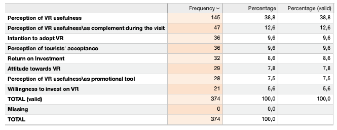 The content analysis of the interviews was conducted following the QDA, allowing for the identification of patterns and underlying meanings in the participants' responses. The transcriptions were carefully reviewed and organised into units of meaning, also known as units of meaning. These units were later grouped into thematic categories, enabling a deeper understanding of the data. MAXQDA20 software was used to transcribe, organise, and analyse the participants’ reports, enabling information to be coded and categorised according to the study’s objectives. This systematic approach allowed for rigorous examination of emerging themes, patterns, and trends in the responses and facilitated the interpretation of relationships among those themes. As a result, the study gained deeper insights into the factors driving tourism businesses to adopt VR mechanisms, culminating in relevant and reliable findings (Gizzi & Rädiker, 2021; Kuckartz & Rädiker, 2019).