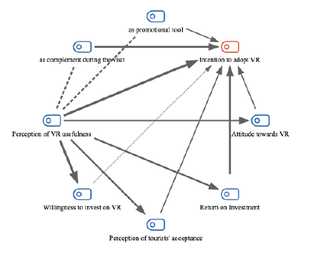 Analysing the origin of the relationships among the determinants highlighted by the software in Figure 5 allows us to understand how these relationships are established. Based on this approach, we can perceive the effect of these determinants on the intention to adopt VR, including relevant indirect relationships that may also exert influence (Figure 5). This process confirms the importance of various factors in the adoption of VR in this sector. Firstly, the perceived usefulness of VR emerged as a key determinant in this context, significantly influencing managers’ intentions to adopt VR mechanisms in wine tourism companies. In addition, attitudes toward VR proved to be a crucial factor, as managers recognised VR’s potential to differentiate their businesses in a competitive wine tourism market. These findings confirm that both the perception of usefulness and a favourable attitude toward VR effectively encourage the adoption of this technology, aligning with the notion that the TOE and TAM frameworks can play a decisive role in explaining managers’ perceptions and attitudes in this sector (Iftikhar et al., 2023; Liu & Jiang, 2024).