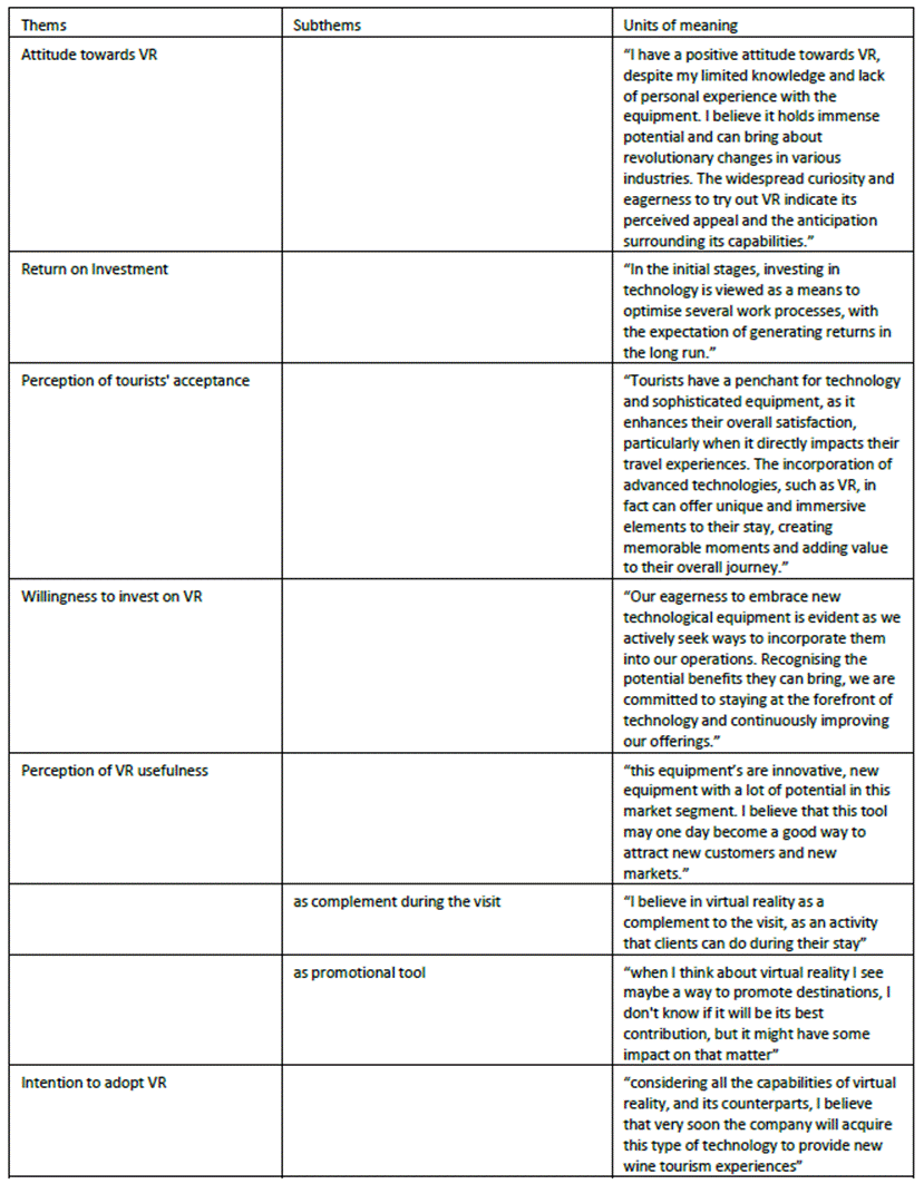 In this section, we present and discuss the results obtained from the interviews conducted with managers of wine tourism companies regarding their intention to adopt VR mechanisms. The collected information was thoroughly analysed, allowing for a deep understanding of the participants' perceptions, opinions, and experiences. Table 1 shows the characterisation of the sample used in this study. Most participants are male. In addition, it was found that participants are predominantly aged between 30 and