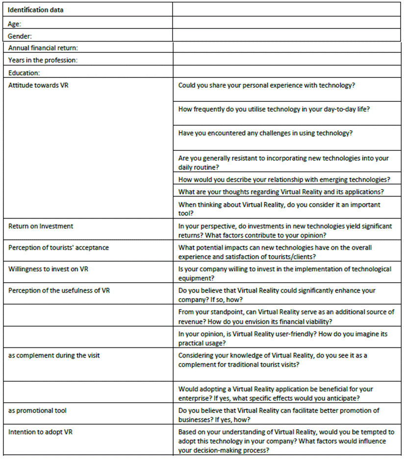 In fact, only a few studies have investigated managers' intention to adopt VR strategies and the benefits this technology can bring to wine tourism (Maumon & Bédé, 2023). In addition, the study by Folgado-Fernández et al. (2023) concludes that tourism destination managers need to implement new positioning strategies based on VR experiences. Therefore, it is essential to understand the factors that influence the intention of wine tourism company managers to adopt VR and to determine whether the sector is open to including this type of innovative mechanism in its business models. Based on this understanding, this study aims to explore the intention of managers of wine tourism companies to adopt VR. Interviews were conducted with managers in the sector to understand their perspectives, challenges, and potential benefits related to the adoption of this technology. By analysing the responses obtained, we aim to identify the factors that influence managers’ intention to adopt VR and clarify the role of this technology in this specific segment.
