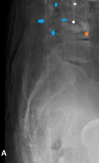 Figura 1: Radiografia lombo-sagrada na incidência de perfil (A), visualizando-se afundamento da plataforma somática superior de L3 e L4 (asteriscos) e presença de material radiodenso no espaço intervertebral L3-L4 no contexto de pós vertebroplastia (seta laranja). Discreta área radiolucente em topografia do maciço articular posterior de L3-L4 (setas azuis).