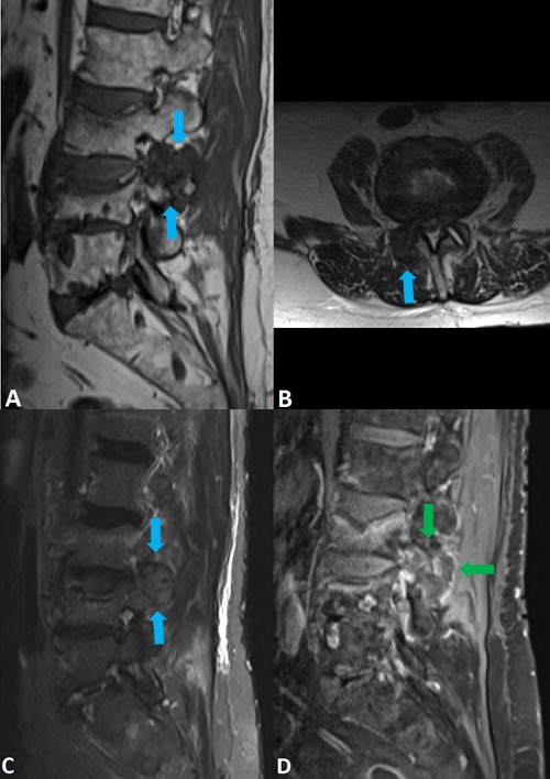 Figura 2: Imagens de ressonância magnética da coluna lombar (Siemens Magneton SymphonyTM, (A) T1 sagital, (B) T2 axial, (C) T2fs sagital, (D) T1fs axial, após administração endovenosa de gadolínio ) revela lesão lobulada adjacente às facetas articulares L3-L4 direitas (seta azuis). A lesão é marcadamente hipointensa em T1 (A), com sinal predominantemente hipointenso em T2 (B e C) e com realce periférico no estudo dinâmico (seta verde em D).