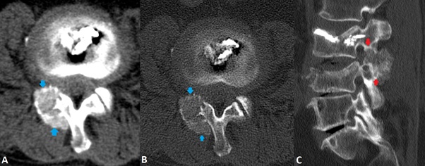 Figura 3: Imagens de tomografia computorizada espectral da coluna lombar (Phillips 7500TM, (A) janela tecidos moles axial, (B) janela óssea axial, (C) janela óssea sagital) visualizando-se lesão de densidade em vidro despolido (setas azuis), calcificada à periferia, condicionado erosões nas facetas articulares de L3-L4 direitas (setas vermelhas).