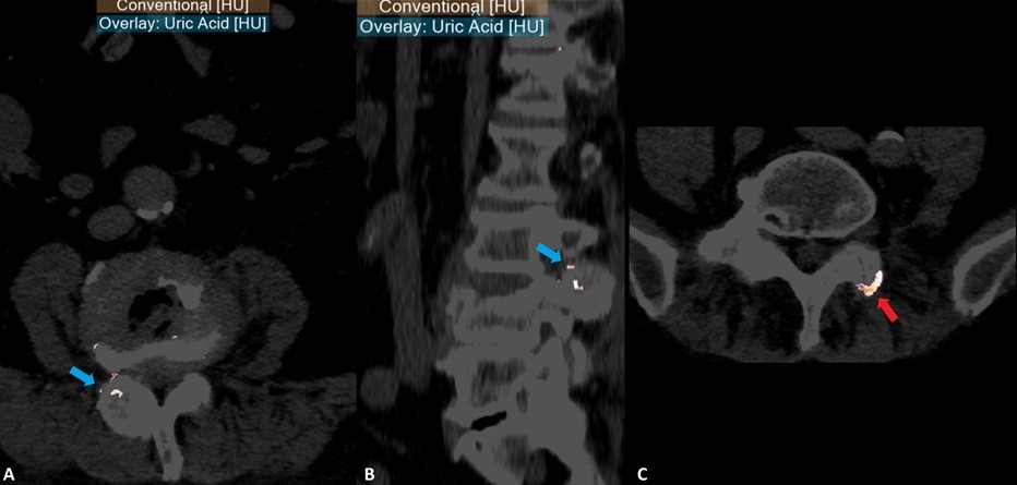 Figura 4: Imagens de tomografia computorizada espectral da coluna lombar (Phillips 7500TM , mapa de sobreposição de imagem convencional com deposição de ácido úrico, (A) axial, (B) sagital, (C) axial) revela deposição de cristais de monourato de sódio na localização da lesão localizada entre as facetas articulares L3-L4 direitas (setas azuis em A e B), rodeados por infiltrado inflamatório. Adicionalmente, verificou-se a presença de cristais de monourato de sódio noutras localizações da coluna lombar (seta vermelha).