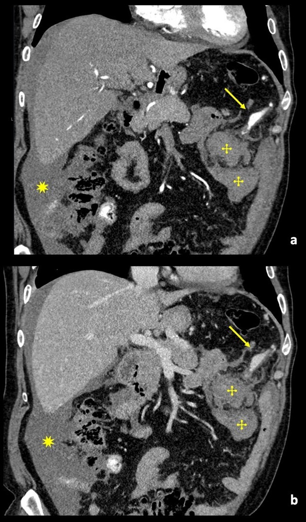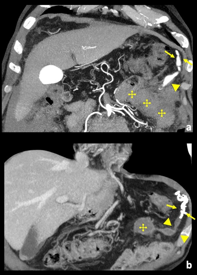 Figure 1: Contrast-enhanced coronal angio-CT reconstruction, in arterial phase (a) and venous phase (b), showing a multilobulated aneurysm sac (arrow) of the left gastroepiploic artery, without evidence of active hemorrhage. Adjacent to the aneurysmatic sac an intraperitoneal hematoma can be seen (✣). Hemoperitoneum (✷).
