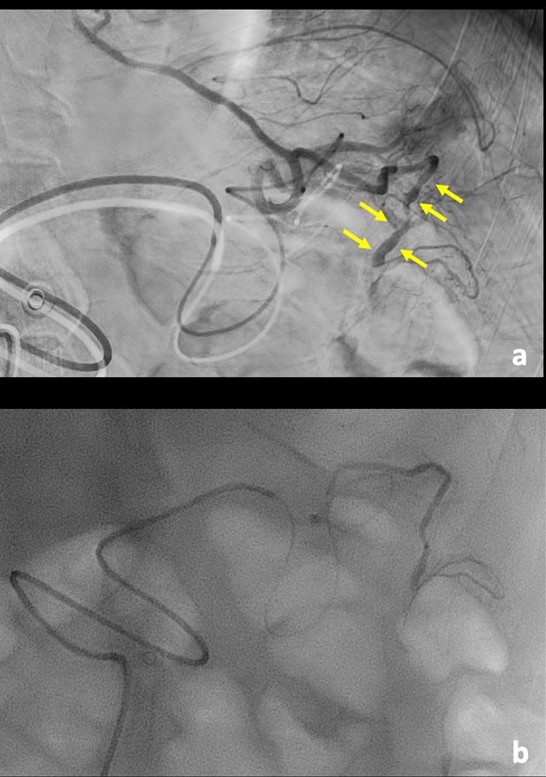 Figure 3: Comparison between contrast-enhanced coronal angio-CT MIP reconstruction pre-procedure (a), and, coronal image at the same level 1-month after embolization (b). (a) A long ectatic vessel with multilobulated aneurysms can be seen (arrow). (b) Corresponding image after embolization shows spontaneous thrombosis of the more distal and bigger aneurysmal sac (arrowhead) and hyperdense rich embolic material just upstream (arrow), corresponding to angiographic diagnostic image; there was hematoma re-absorption (✣), and there was no mass underlying.