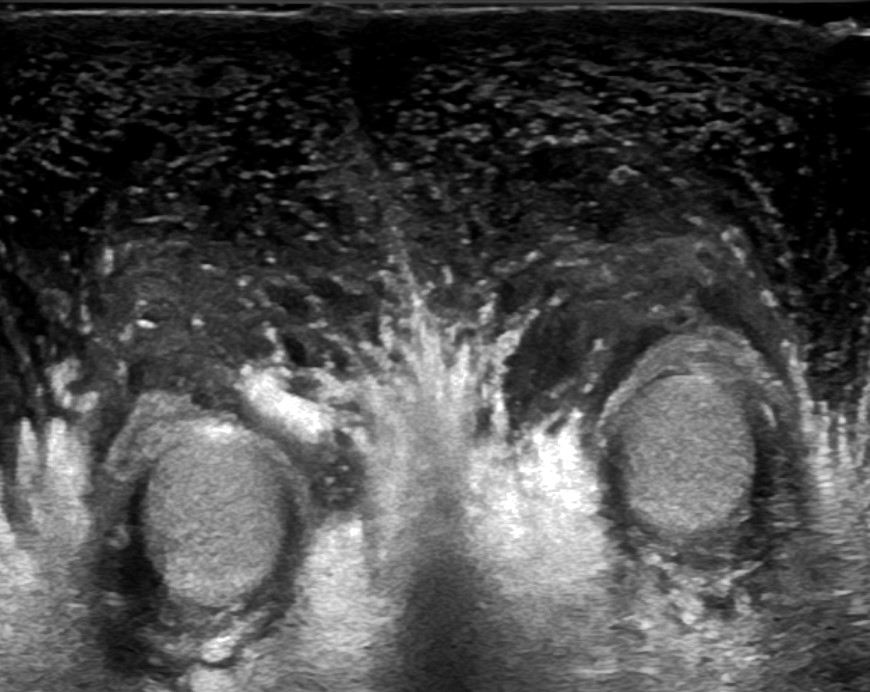 Figure 1: Transverse US scan showing diffuse thickening of the scrotal wall and pronounced subcutaneous edema, with unremarkable testes and epididymis.