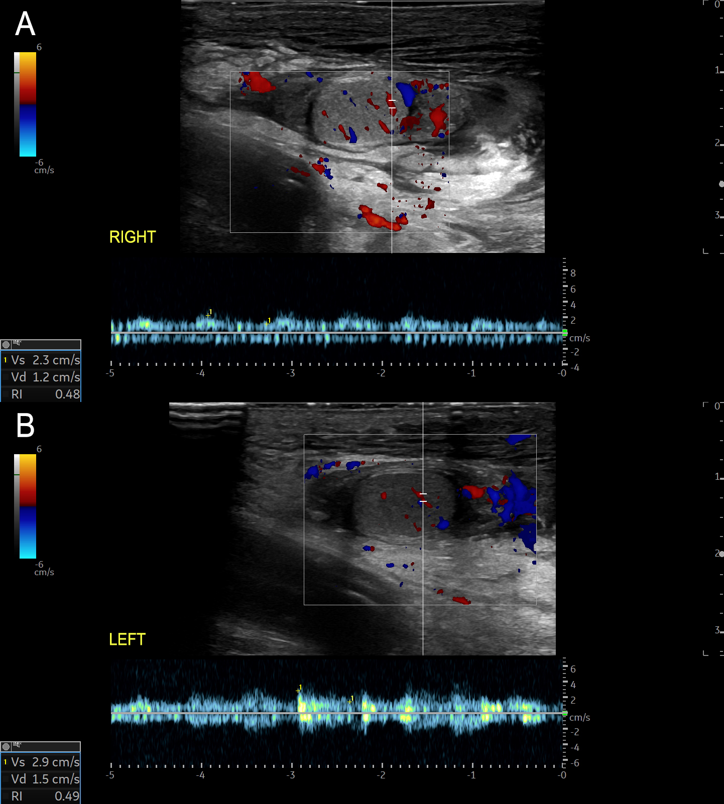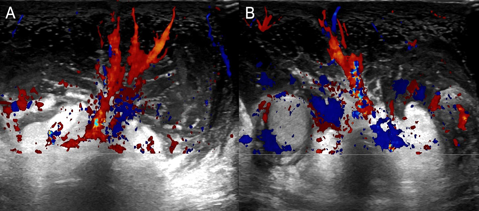 Figure 2: Transverse Color Doppler scans (A and B) showing the "fountain sign" (increased scrotal wall blood flow, resembling a colored fountain).