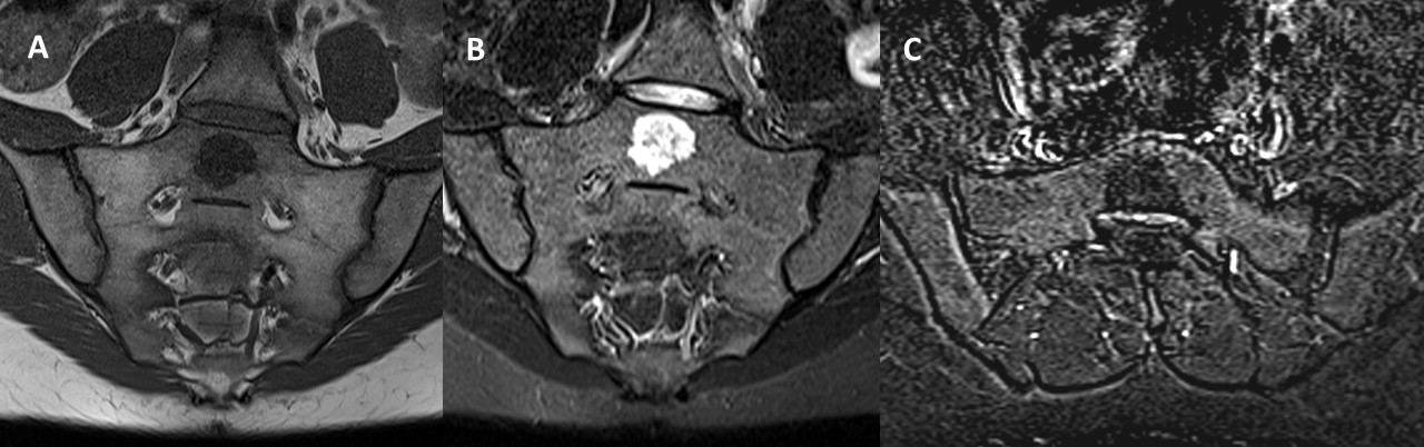 Figure 1: Coronal oblique T1-weighted (A), STIR (B) and axial oblique T1 fat saturated post-contrast subtraction (C) MRI images demonstrate a lesion in the midline of the S1 vertebral body with heterogeneous T2 hyperintensity and T1 hypointensity. No evidence of post-contrast enhancement or surrounding edema was observed.
