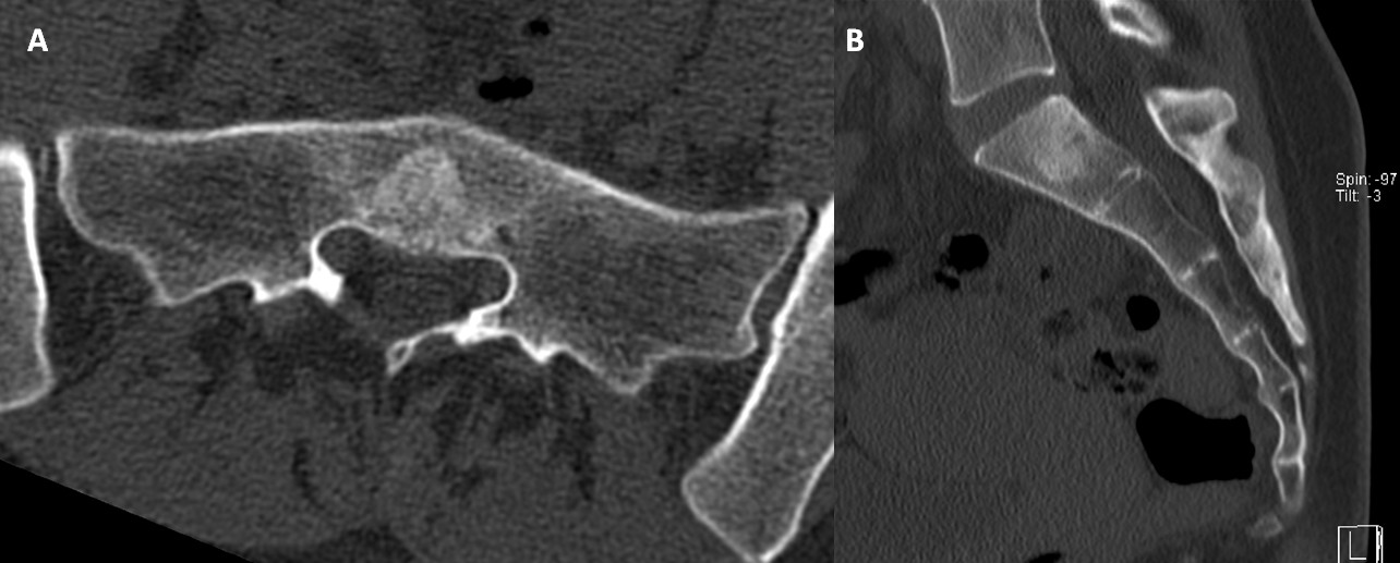 Figure 2: Axial (A) and Sagittal (B) CT images of the lumbosacral spine show a mild osteosclerotic lesion in the midline of the S1 vertebral body, with poorly defined margins and preservation of the trabecular bone pattern. No evidence of bone destruction or soft tissue involvement is observed.