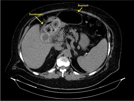 Figure 1: Unenhanced axial CT slice showing large gallstones impacted in the duodenum, causing gastric outlet obstruction (Bouveret syndrome). The gallbladder was contracted, suggesting that a cholecystoduodenal fistula had been formed, from which the stones passed to the duodenum.