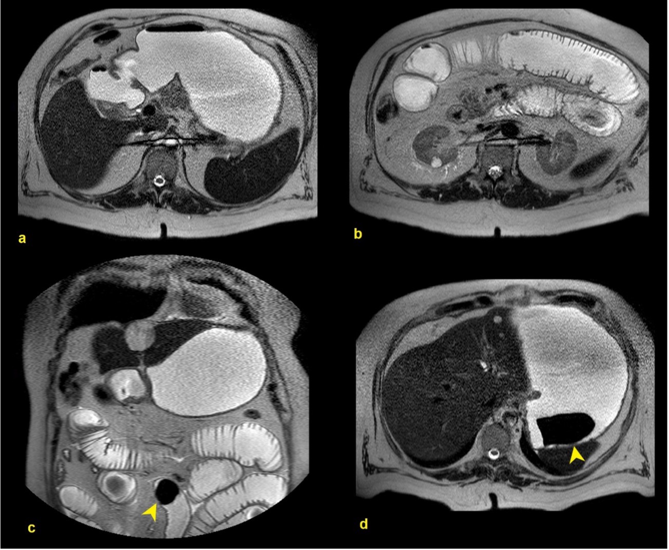 Figure 2: T2-weighted axial (a, b, d) and coronal (c) images of an MRI performed one week later. No gallstones were identified in the duodenum (a). Instead, several dilated fluid-filled small bowel loops could now be observed (b). Even though the MRI did not include the pelvis, the cause of the obstruction was a large gallstone that was found in the ileum (c, arrowhead). Another gallstone could be observed in the stomach (d, arrowhead).