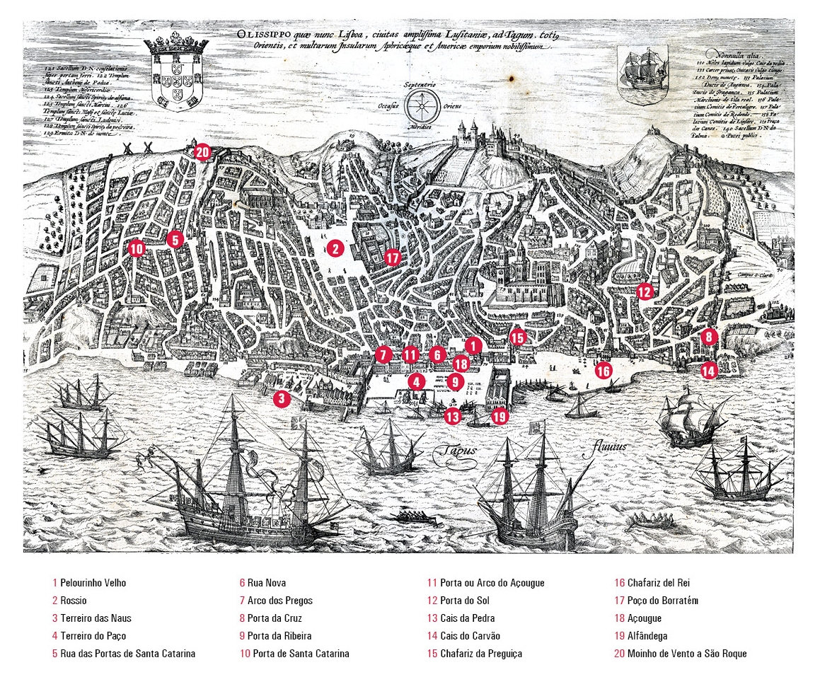 Figura 1 Planta da cidade de Lisboa com a localização dos lugares referidos nas fontes inquisitoriais, retirada de Civitates Orbis Terrarum, Georg Braun e Franz Hogenberg (1596).