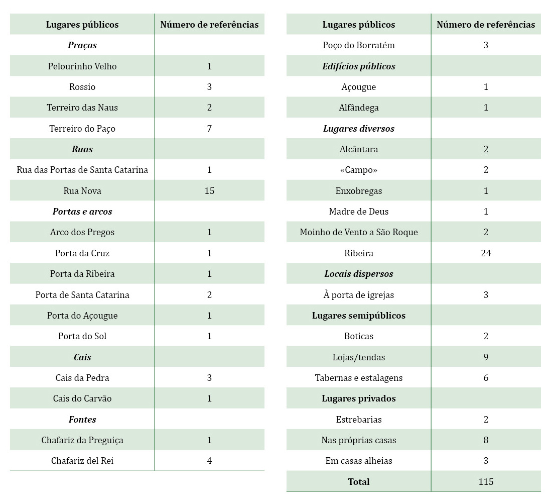 Podemos classificar os espaços em que decorreram os breves encontros aqui apresentados em públicos, semipúblicos e privados. Os primeiros, espaços abertos à presença e circulação quer dos moradores quer de quem estivesse de passagem, predominam nesta amostra, embora muitas das revelações que motivaram os processos do Santo Ofício tenham ocorrido no interior dos domicílios, entre familiares, vizinhos ou conhecidos. No entanto, quase não são aqui referidos, pela sua semelhança e pouco interesse para o conhecimento dos lugares de sociabilidade urbana, objeto deste estudo.