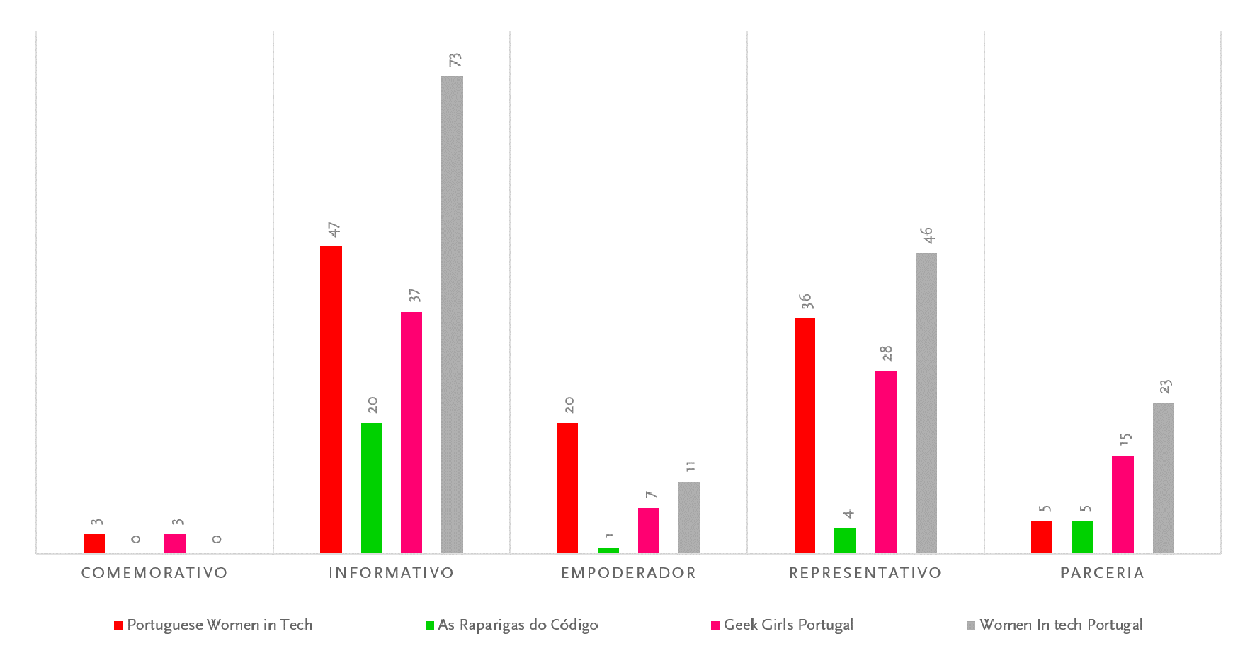 Se, por um lado, os conteúdos e representações são empregados de maneira a democratizar o conteúdo e facilitar que o acesso chegue às raparigas e mulheres, por outro, identificamos em nossa análise que, apesar de se tratar do contexto português, o idioma utilizado pelas páginas era em sua maioria o inglês. Notamos, embora não fosse o nosso foco inicial, que a Portuguese Women In Tech publicou 74% do seu conteúdo em inglês e sem tradução; As Raparigas do Código publicou 100% do seu conteúdo em português; a Geek Girls Portugal publicou 58% do seu conteúdo em inglês; e a Women In Tech Portugal publicou 90% do seu conteúdo em português. No caso da Geek Girls Portugal, observamos que os conteúdos eram publicados em inglês quando o idioma oficial do evento ou atividade realizada seria neste idioma. Já a Women In Tech Portugal apresentava em suas imagens conteúdos em inglês, mas em 90% dos casos utilizava o espaço da legenda para traduzir o texto e passar a mensagem também em português.