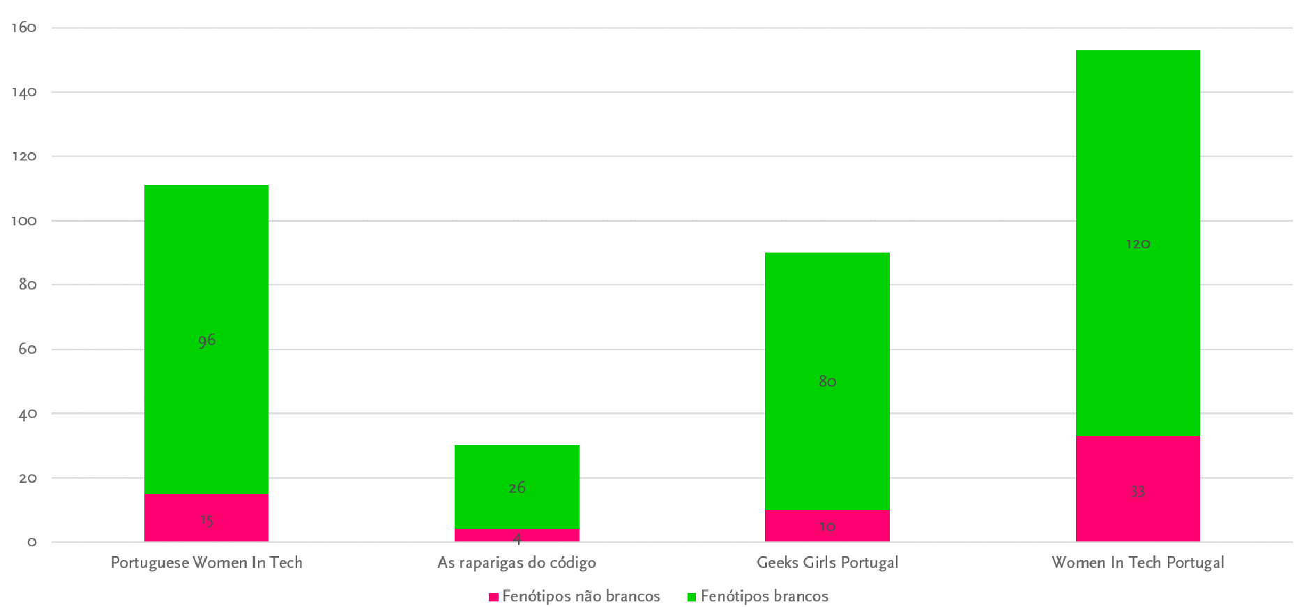 Os dados analisados (Figura 3) nos mostraram que a página da Women In Tech Portugal foi a que mais apresentou diversidade neste quesito, já que 22% de suas publicações são de mulheres com fenótipos diferentes do branco. Segue-se a Portuguese Women In Tech com 14%, As Raparigas do Código com 13% e, por último, a Geek Girls Portugal com 11%.