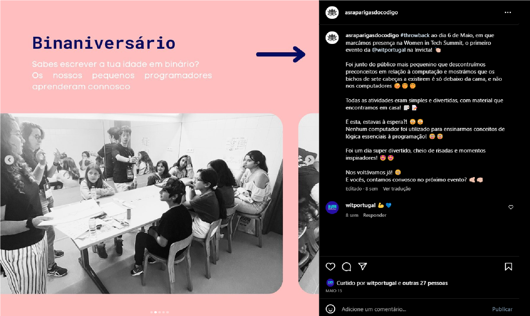 Fonte. Retirado de #throwback ao dia 6 de Maio, em que marcámos presença na Women in Tech Summit, o primeiro evento da @witportugal na Invicta! [Fotografia], por As Raparigas do Código [@asraparigasdocodigo], 2023, Instagram. (https://www.instagram.com/p/CsRyWXJszQ9/?img_index=2)