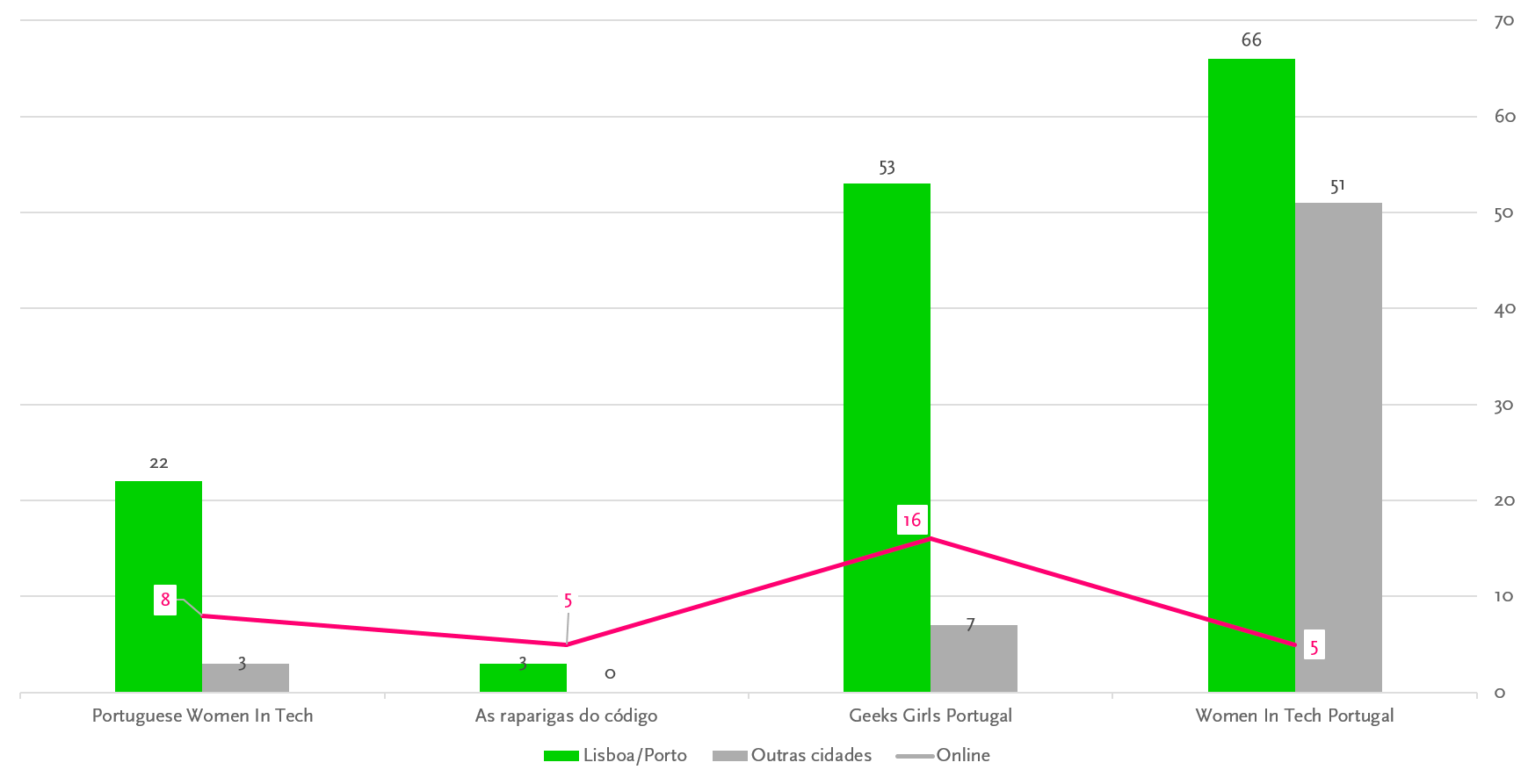 Quanto à geolocalização, a maior parte dos eventos e atividades promovidos pelas instituições estavam concentrados nas cidades de Lisboa e Porto, refletindo uma centralização geográfica que pode limitar a participação de mulheres de outras regiões. A descentralização das atividades e a promoção de eventos online poderiam ampliar o alcance e a participação de mulheres em diferentes locais, contribuindo para a redução das desigualdades regionais no acesso às TIC.