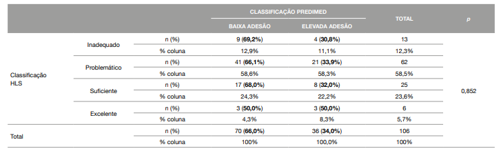 Em seguida, procurou-se relacionar a classificação obtida no questionário HLS com a classificação do questionário PREDIMED (Tabela 1). Assim, concluiu-se que a maioria dos inquiridos possui um nível de LS “problemático” (58,5%) e revelou “Baixa Adesão” ao PAM (66,0%). Verificou-se que, os participantes com nível de LS “inadequado”, “problemático” e “suficiente” estavam principalmente associados a uma “Baixa Adesão” ao PAM, sendo as respetivas percentagens de 69,2%, 66,1% e 68%, respetivamente. Compreendeu-se ainda que os participantes com o nível mais baixo de LS apresentaram a menor percentagem de “Elevada Adesão” ao PAM. Apenas nos participantes com um nível “excelente” de LS se verificou um aumento considerável na percentagem de “Elevada Adesão” à Dieta Mediterrânica tendo sido obtido um resultado de 50,0%. Ainda assim, os resultados não foram estatisticamente significativos no que diz respeito à classificação do PREDIMED em função da classificação no HLS-EU-PT (p>0,05).