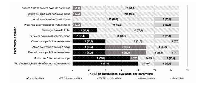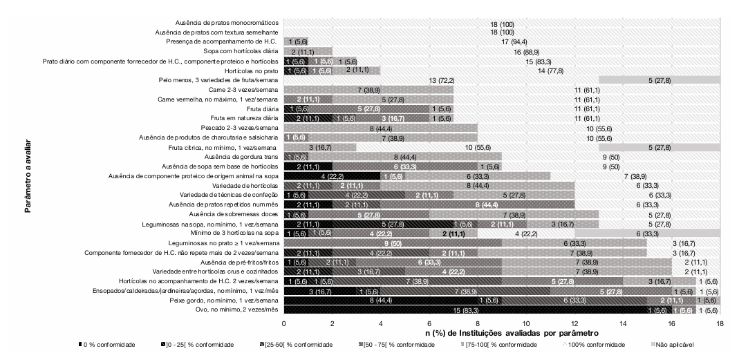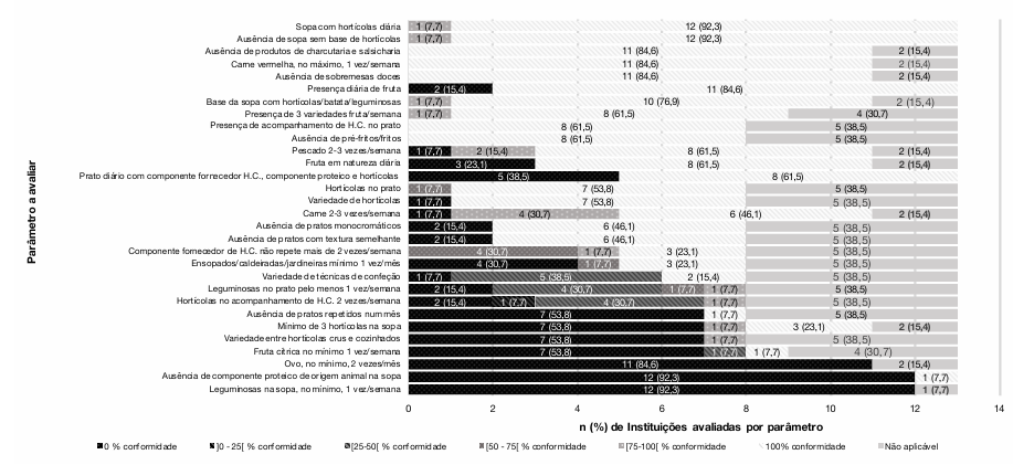 Após a aplicação desta ferramenta, calculou-se a % de conformidade nas 12 semanas em estudo para cada item. Esta variável foi, posteriormente, parametrizada em 0%, >0-<25 %, 25-<50 %, 50-<75 %, 75-<100 % e 100% de conformidades. De seguida, calculou-se uma média da totalidade das % de cada item avaliado, de forma a obter um valor médio da qualidade das ementas de cada instituição.