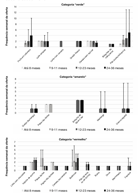 Neste estudo, a oferta alimentar das creches mostrou-se nutricionalmente desadequada, destacando-se, no almoço, o excesso de oferta de fruta confecionada na faixa etária dos 6 aos 8 meses, a oferta simultânea de sopa e de prato com componente proteica na faixa etária dos 9 aos 11 meses e a ausência da oferta de peixe gordo e ovo no prato para os 12 aos 36 meses. No lanche, todas as instituições disponibilizavam pelo menos um alimento rico em açúcar e/ou gordura, oferecido uma vez por semana.