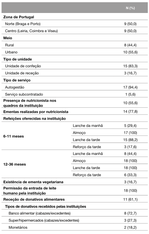 Da totalidade das IPSS, 55,6% (n=10) situavam-se em meio urbano, 83,3% (n=15) funcionavam como unidades de confeção de refeições e 94,4% (n=17) possuíam um serviço de alimentação em autogestão. Em catorze instituições (77,8%) as ementas eram realizadas por um nutricionista, mas apenas 10 (55,6 %) tinham este profissional nos seus quadros de pessoal. Salienta-se que 61,1% das IPSS recebia donativos alimentares, sendo a grande maioria proveniente do Banco Alimentar (72,7%). Relativamente às refeições disponibilizadas, todas as instituições ofereciam a refeição almoço e quase a totalidade ofereciam o lanche da tarde (88,2% para a faixa dos 6 aos 11 meses e 100% dos 12 aos 36 meses). Contudo, apenas cinco (29,4%) e oito instituições (44,4%) ofereciam o lanche da manhã para as crianças entre os 6 e os 11 meses e para crianças entre os 12 e os 36 meses, respetivamente (Tabela 2). A água foi a única bebida disponibilizada à refeição e o azeite a única gordura utilizada na confeção em todas as IPSS do presente estudo. A adição de sal na preparação e confeção das refeições verificou-se em 10 instituições (83,3%) nas refeições dos 6 e os 8 meses e na totalidade das mesmas (n=18) a partir dos 9 meses.