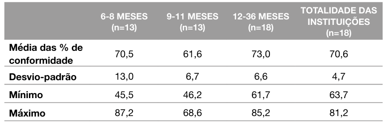 No que concerne à avaliação qualitativa da oferta alimentar, procedeu--se à recolha (por email) dos planos de ementas do almoço relativas a 3 meses (12 semanas) anteriores ao início do projeto e da ementa dos lanches (ementa única). Posteriormente, foram criadas duas bases de dados, uma relativa à refeição do almoço e a outra, à refeição do lanche. Para avaliar as ementas do almoço de cada instituição e construir a respetiva base de dados, foi aplicada, por quatro investigadores do projeto, a ferramenta de avaliação qualitativa de ementas de almoço, desenvolvida no âmbito do projeto C2S (13), recorrendo às recomendações da Direção-Geral da Saúde (DGS), da European Society for Paediatric Gastroenterology Hepatology and Nutrition (ESPGHAN) e da Organização Mundial da Saúde (OMS) (14-16). Esta ferramenta considera três faixas etárias distintas: 6 a 8 meses, 9 a 11 meses e 12 a 36 meses, e é composta, respetivamente, por um total de 23, 47 e 48 itens, passíveis de serem avaliados como “Conforme”, “Não Conforme” ou “Não Aplicável” (13). A opção “não aplicável” foi utilizada sempre que a informação disponibilizada na ementa não permitia responder ao respetivo item, ou quando a instituição não disponibilizava a refeição relacionada com o item. A ferramenta apresenta grupos de itens distintos por cada grupo etário. O grupo dos itens dos “Critérios Gerais”, “Sopa”, “Sobremesa” e “Alimento fornecedor de proteína vegetal” está presente dos 6 aos 36 meses. Por outro lado, o grupo de itens “Alimento fornecedor de proteína animal”, “Componente fornecedor de hidratos de carbono”, “Leguminosas” e “Hortícolas” apenas se encontra presente dos 9 aos 36 meses.