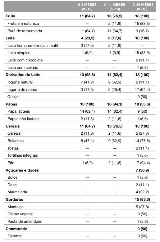 Nos lanches, em todas as instituições, verificou-se a oferta de um ou mais alimentos ou bebidas classificadas como dos grupos “amarelo” ou “vermelho” do semáforo nutricional (Gráfico 4). Especificamente, até aos 11 meses de idade, os alimentos mais oferecidos foram as papas lácteas (82,4%), a fruta em puré ou ralada/triturada (64,7%) e as bolachas (47,1% dos 6 aos 8 meses e 52,9% dos 9 aos 11 meses), como é exemplo as bolachas tipo maria, torradas e tostadas. Observou-se que os alimentos disponibilizados com maior frequência às crianças dos 12 aos 36 meses foram os iogurtes de aroma (94,4%), o pão (94,4%) e o leite simples (83,3%) (Tabela 4).