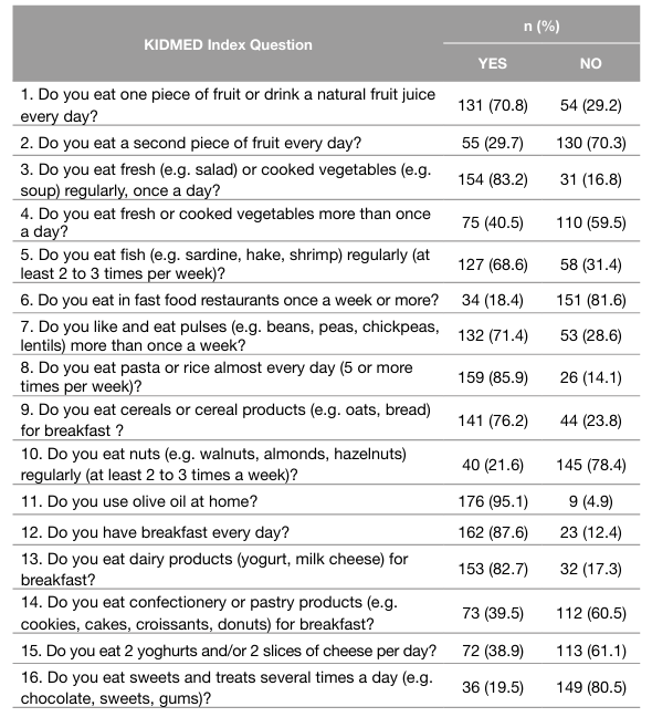 Ethics: The present research work used secondary data from the study “Reproducibility and validity of the Mediterranean Diet Quality Index (KIDMED Index) in a sample of Portuguese adolescents” (32) whose execution was conducted according to the guidelines laid down in the Declaration of Helsinki and all procedures involving human subjects were approved by the Ethic Committee from the Institute of Public Health of the University of Porto (number CE19127).