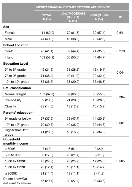 Table 2 Sample characterization, total and according to the level of adherence to the Mediterranean Dietary Pattern (n = 185)