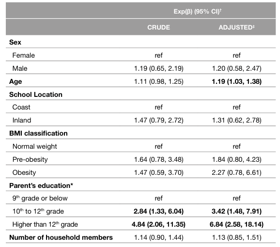 Data collection: Data collection was performed during the school season, from January to March 2020. The personal data of each participant was initially collected, namely, sex, age, weight and height (self-reported), location of the school (coast versus inland), adolescent’s level of education, parent’s level of education, total household monthly income and composition.
