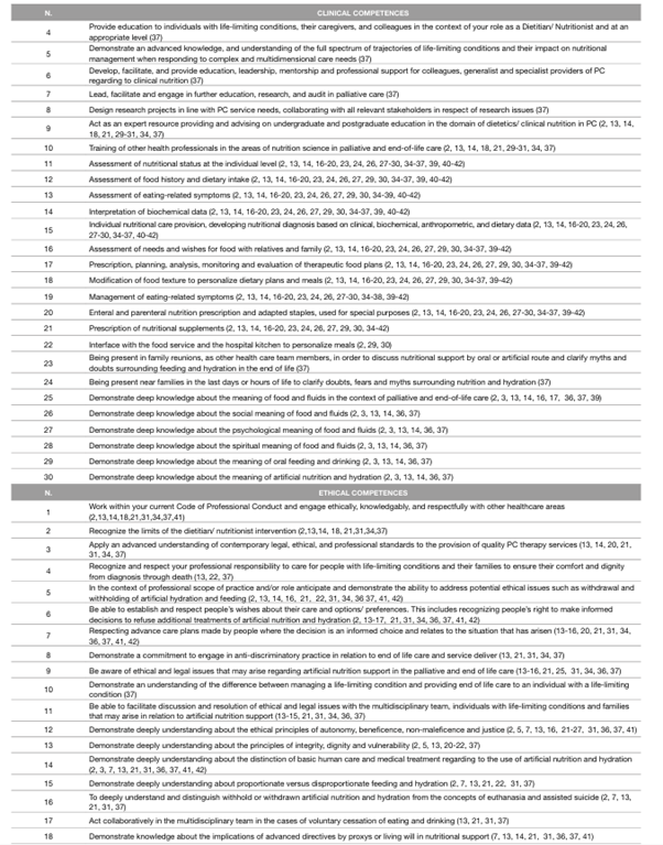 From the set of publications were found: 18 literature reviews (2, 3, 5, 7, 10, 14, 16, 17, 22-27, 33, 35-37, 41), 3 original articles (15, 19, 30), 2 book chapters (13, 18), 2 position statement (21, 31), 1 guideline article (34), 2 professional articles (29, 42), 2 books (20, 39), 1 white paper (32), and 1 taskforce document (37). After being identified the competences were written and grouped in three dominions according to the area they were associated with: the core competences mainly defined by the European Association for Palliative Care (EAPC) (32) and by the PC Competence Framework Steering Group of Dublin (37); the clinical competences regarding the area of clinical nutrition; and the ethical competences where all the subjects related to ethical issues were included. After the organisation and writing of competences in these dominions, the results were: 13 core competences, 30 clinical competences, and 18 ethical competences (Table 1).