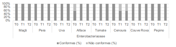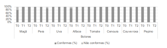 Relativamente aos critérios de higiene, cargas microbiológicas não conformes de microrganismos a 30 ºC podem indicar incumprimento das boas práticas de higiene, utilização de matérias-primas de má qualidade ou quebra da cadeia de frio. Contudo, importa considerar que cargas superiores de microrganismos a 30 ºC em hortofrutícolas não devem ser atribuídas diretamente à falta de higiene ou a uma alteração do produto, pois em alimentos crus e prontos a consumir, como é o caso dos hortofrutícolas, é provável haver cargas de 106 a 108 ufc/g, levando a diminuição do tempo de prateleira (1, 2). Cargas não conformes de Enterobacteriaceae sugerem incumprimento das boas práticas de higiene (1, 2). Contudo, é importante analisar as cargas de Enterobacteriaceae juntamente com outros critérios (1, 2). No que diz respeito aos critérios de segurança identificados no Regulamento (CE) Nº 2073/2005, os resultados obtidos no presente estudo apresentam cargas conformes nas três etapas T0 (sem lavagem), T1 (lavagem com água potável) e T2 (desinfeção). À semelhança de resultados obtidos por Bachelli et. al. (9), todas as amostras estavam satisfatórias para Salmonella. Foram detetadas cargas não conformes de S. coagulase positiva (cargas < 104 ufc/g) em uvas em T0 (sem lavagem) e T1 (lavagem com água potável), na alface em T0 (sem lavagem), T1 (lavagem com água potável) e T2 (desinfeção) e na couve roxa em T0 (sem lavagem), não se tendo verificado diferenças estatisticamente significativas entre estas três etapas. Os resultados não conformes nas amostras de alface podem ser explicados pela presença de pragas (piolho da alface e lesmas). Poderá ter ocorrido transmissão de S. coagulase positiva por manipulador portador, nas fases de produção, distribuição ou preparação do alimento (2). Não se verificaram diferenças estatisticamente significativas para nenhum dos hortofrutícolas em estudo entre a lavagem com água potável (T1) e a desinfeção (T2). Os resultados obtidos no presente estudo estão em concordância com estudos publicados, sugerindo que as cargas microbiológicas de hortofrutícolas submetidos a desinfeção com produto à base de cloro são semelhantes às de hortofrutícolas lavados com água potável (6, 9, 18). Apesar das várias recomendações indicando que a água potável é suficiente para eliminar terra e outros contaminantes dos hortofrutícolas (3-5, 7, 19-21), são necessários mais estudos comparando a eficácia da sua lavagem com água potável e a desinfeção com hipoclorito do sódio, bem como a sua implicação no consumo de água. Nesse sentido, o presente estudo contribui para a evidência atual relativamente a este tema e para a redução do consumo de água. Com o objetivo de monitorizar os resultados obtidos, estão a ser analisadas amostras de hortofrutícolas entregues pelos fornecedores.